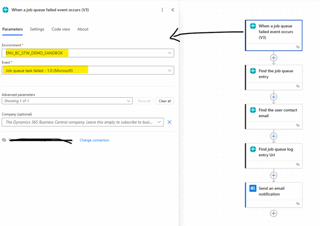 1. Environment This field specifies the Business Central environment where the job queue failure occurred. It is dynamically filled using the value from the trigger, so the action will execute in the same environment where the job failure was detected. In your case, it appears to be something like ENV_BC_STW_DEMO_SANDBOX.