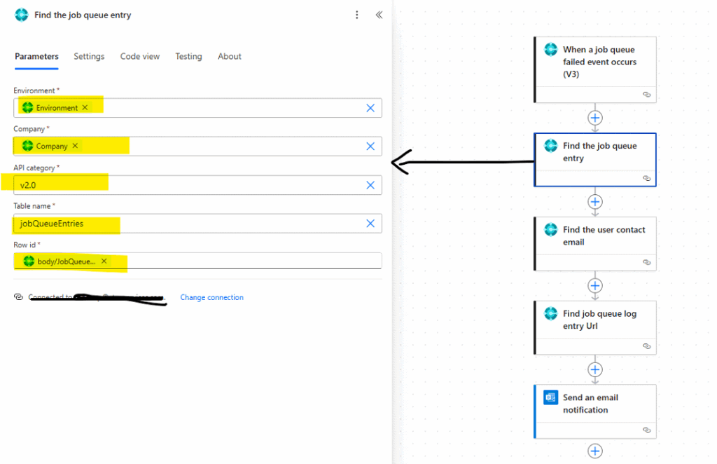 This screen shows the configuration for the “Find the job queue entry” step in your Power Automate flow. This step comes right after the trigger “When a job queue failed event occurs (V3)” and is responsible for fetching detailed information about the failed job queue entry from Dynamics 365 Business Central.