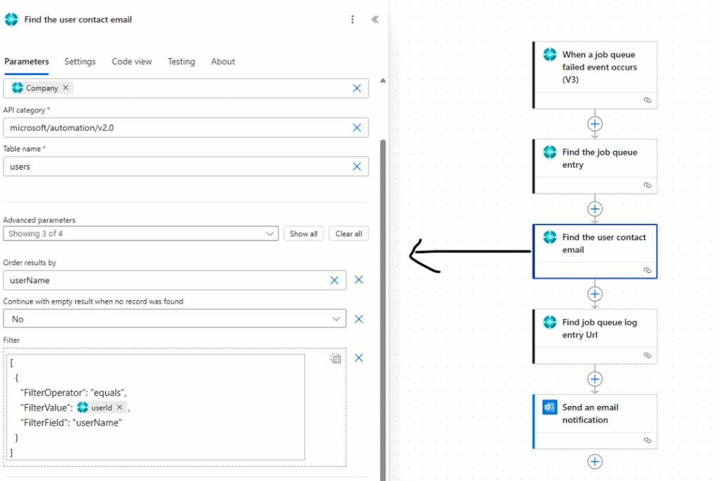 After identifying the failed job, the flow proceeds to “Find the user contact email”. This action locates the email address of the user who is responsible for the job. By doing so, we can ensure that the notification is sent directly to the person who can take the necessary corrective action, instead of broadcasting alerts to an entire team.
