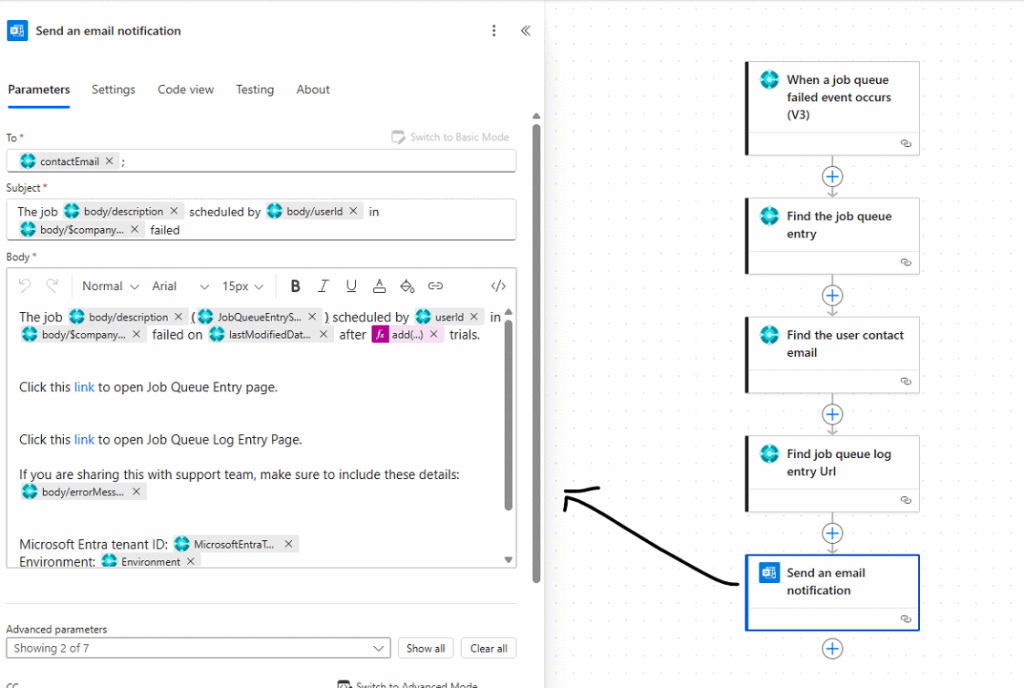 We extract the URL to the job queue’s log entry in Business Central. This allows the recipient to click the link and investigate the error immediately, saving time and guesswork.