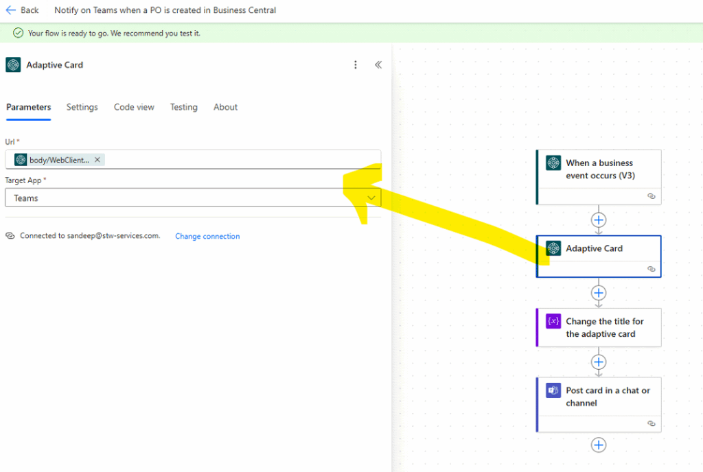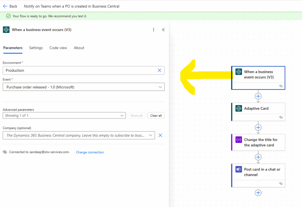 This ensures the flow is triggered as soon as a PO is finalized and marked ready in Business Central.
