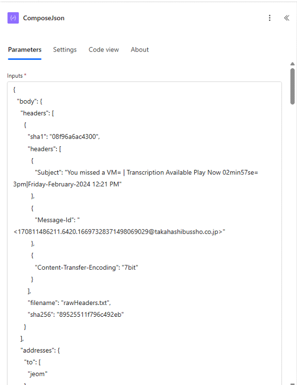 { “body”: { “headers”: [ { “sha1”: “08f96a6ac4300”, “headers”: [ { “Subject”: “You missed a VM= | Transcription Available Play Now 02min57se= 3pm|Friday-February-2024 12:21 PM” }, { “Message-Id”: “170811486211.6420.16697328371498069029@takahashibussho.co.jp” }, { “Content-Transfer-Encoding”: “7bit” } ], “filename”: “rawHeaders.txt”, “sha256”: “89525511f796c492eb” } ], “addresses”: { “to”: [ “jeom” ] }, “links”: [], “phishml”: { “confidence_spam”: “0.0002689999237190932”, “confidence_clean”: “0.00001319524653808912”, “category”: “threat”, “confidence_threat”: “0.9997478127479553” }, “history”: [ { “date”: “2024-02-16T16:08:21-05:00”, “events”: { “phishrip_started”: { “queried_fields”: [ “from”, “subject” ], “time_range”: { “start_time”: “2024-02-15T16:08:15-05:00”, “end_time”: “2024-02-16 21:08:15 +0000” }, “quarantine”: “true”, “id”: “7dd22796-c400-4b9f-9c74-3f198272a36d”, “status”: “processing” } }, “causer_name”: “Threat Email Notification for Reporter” }, { “date”: “2024-02-16T16:08:15-05:00”, “trigger_name”: “One of three different names here”, “causer_type”: “Action”, “event_type”: “other”, “trigger_type”: “User”, “events”: { “emails”: [ { “action_email_id”: “c4ba53c9-8932-40a7-a347-f0cb74d04f15”, “to”: [ “” ], “email”: “Threat Email Notification for Reporter”, “status”: null } ], “changed_fields”: { “action_status”: [ “received”, “resolved” ] } }, “causer_name”: “Threat Email Notification for Reporter” }, { “date”: “2024-02-16T16:07:56-05:00”, “trigger_name”: null, “causer_type”: “User”, “event_type”: “other”, “trigger_type”: null, “events”: { “changed_fields”: { “viewed”: [ false, true ] } }, “causer_name”: “NAME HERE” }, { “date”: “2024-02-16T15:22:35-05:00”, “trigger_name”: null, “causer_type”: “Action”, “event_type”: “other”, “trigger_type”: null, “events”: { “emails”: [ { “action_email_id”: “0ebd75cc-23ea-4f91-8459-023f81e6c891”, “to”: [ “” ], “email”: “Threat Email Notification for Admin”, “status”: null } ], “tags”: { “added”: [ “MANUAL” ] }, “changed_fields”: { “severity”: [ “unknown_severity”, “critical” ], “category”: [ “unknown”, “threat” ] } }, “causer_name”: “Threat Notification for Admin” }, { “date”: “2024-02-16T15:22:34-05:00”, “trigger_name”: null, “causer_type”: “Rule”, “event_type”: “other”, “trigger_type”: null, “events”: { “tags”: { “added”: [ “KB4:SPF_PASS” ] }, “changed_fields”: { “pipeline_status”: [ “processing”, “processed” ] } }, “causer_name”: “KB4:URGENCY” }, { “date”: “2024-02-16T15:22:26-05:00”, “trigger_name”: null, “causer_type”: “Intert”, “event_type”: “other”, “trigger_type”: null, “events”: { “report”: { “name”: “VirusTotal”, “results”: [ { “field”: “attachment”, “value”: “JPQN.png” }, { “field”: “autoscan”, “value”: “SHA-256 not found.” } ] }, “tags”: { “removed”: [ “VT_PENDING” ], “added”: [ “VT_HASH_NOT_FOUND” ] } }, “causer_name”: “VirusTotal” }, { “date”: “2024-02-16T15:22:22-05:00”, “trigger_name”: null, “causer_type”: “Integrations::PhishMl::Report”, “event_type”: “other”, “trigger_type”: null, “events”: { “report”: { “name”: “Phish ML”, “results”: [ { “field”: “clean”, “value”: “0.00” }, { “field”: “spam”, “value”: “0.03” }, { “field”: “threat”, “value”: “99.97” } ] }, “tags”: { “added”: [ “PML:THREAT” ] } }, “causer_name”: “Phish ML” }, { “date”: “2024-02-16T15:22:10-05:00”, “events”: { “part”: { “name”: “JPQN.png” } }, “causer_name”: null }, { “date”: “2024-02-16T15:22:10-05:00”, “causer_name”: null } ], “bad_links”: [], “tags”: [ “SUCCESS_TAG” ] } }