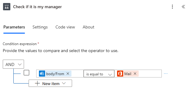 - Set it to compare the From (Email) of the incoming email with the Mail field of your manager (from the Get manager step).