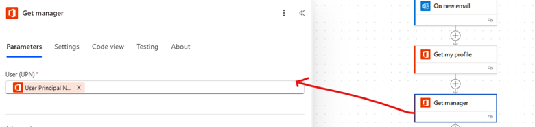 Code line for User (UPN) – ‘outputs(‘Get_my_profile’)?[‘body/userPrincipalName’]’