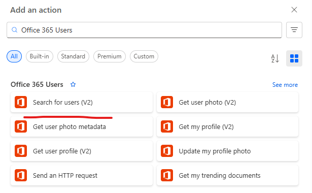- Search for Office 365 Users connector.