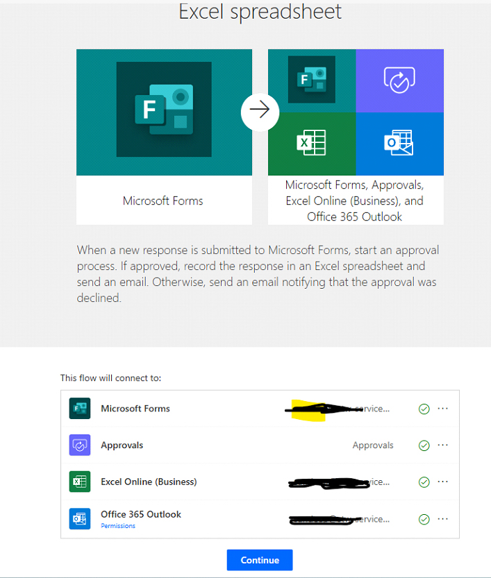 Check the connection for Microsoft Form, approval, Excel online, and Office 365 Outlook. If all connections are okay, click on continue or fix the connection issue using your Microsoft login.