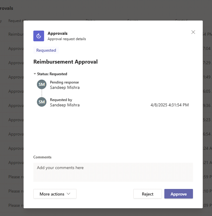 Click on Test in the top right-side bar and fill out the Microsoft form and submit it. You can see an approval/disapproval request in Microsoft Teams like this: