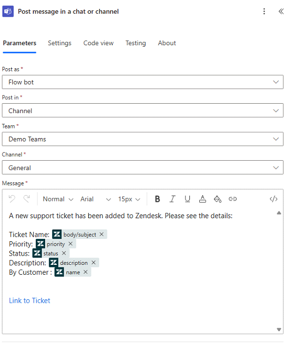 This is the heart of the notification system. We send all ticket details in a Teams channel using a Flow bot. Here’s what goes in the message: